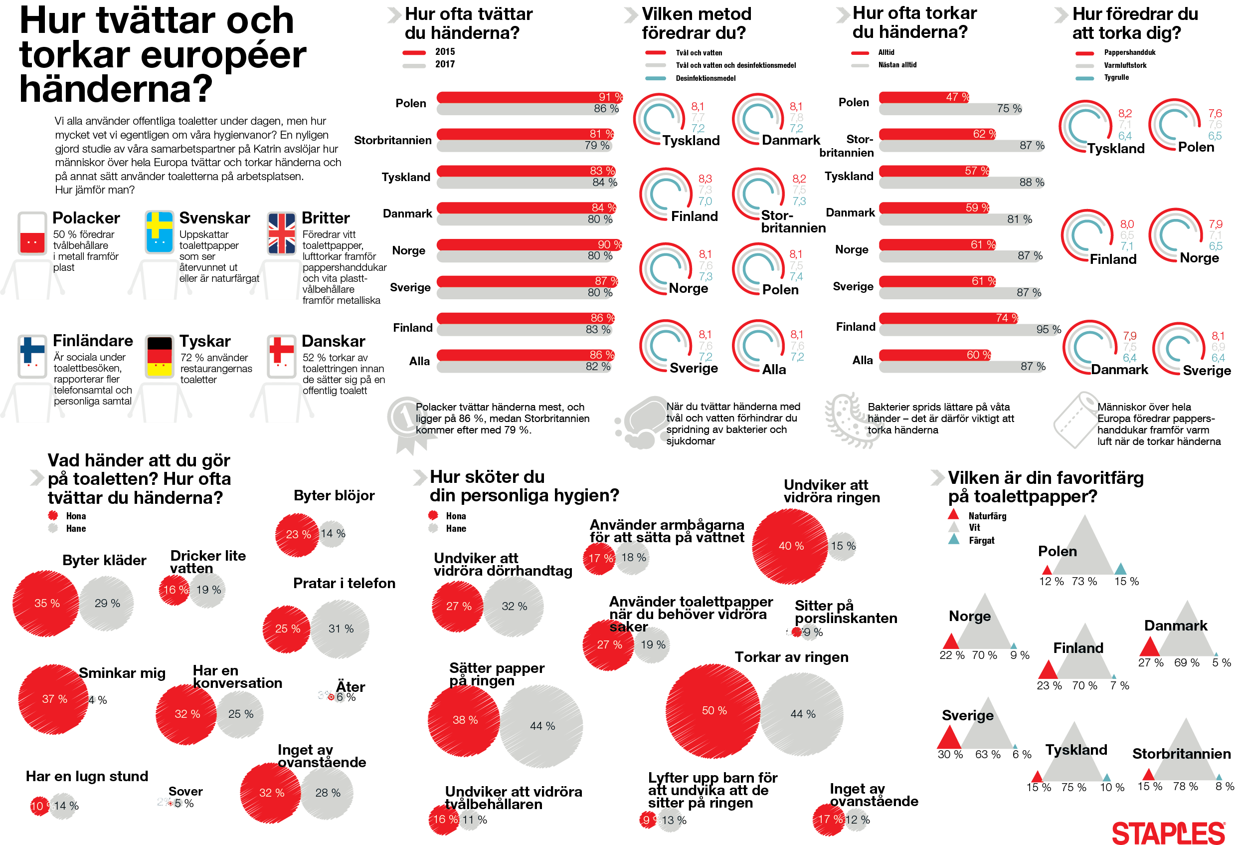 Alla använder vi offentliga toaletter regelbundet, och den typ vi troligen använder oftast är toaletten på kontoret. Du kanske tycker att ditt sätt att använda badrummet, och särskilt hur du tvättar och torkar händerna, är normalt – men runtom i Europa gör människor det lite annorlunda! Med unika data från Katrin, vår partner för hygienlösningar, kan du se hur vanorna skiljer sig runt om i Europa och hur du jämför dem.
